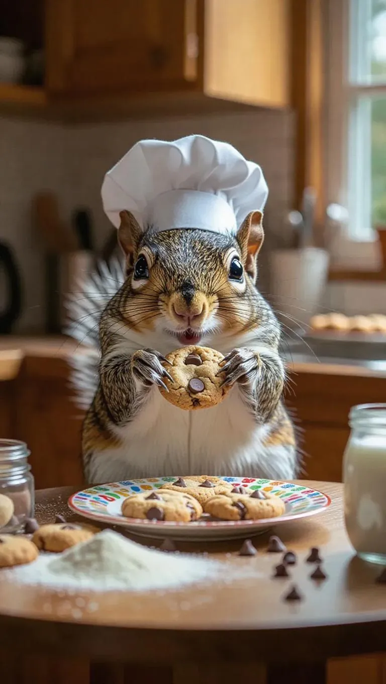 A playful squirrel, dressed in a tiny chef's hat, is baking cookies in a bright, cheerful kitchen. Using a spoon, the squirrel adds chocolate chips to the dough. Ingredients like flour, sugar, and butter are scattered around the counter. After baking the cookies, the squirrel sits at a round kitchen table, beaming as it takes a bite of a warm cookie from a colorful plate.