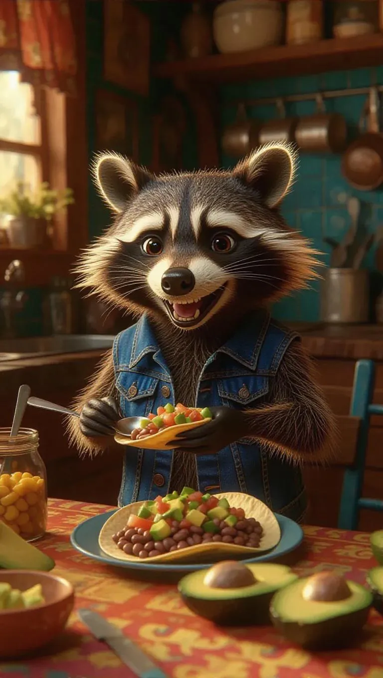 A joyful raccoon, outfitted in a denim vest, is assembling a taco in a funky, eclectic kitchen. Using a spoon, the raccoon fills a tortilla with beans and salsa. Ingredients like diced avocado, shredded lettuce, and crumbled cheese are laid out on the counter. After completing the taco, the raccoon settles at a colorful bar stool, grinning as it bites into the loaded taco.