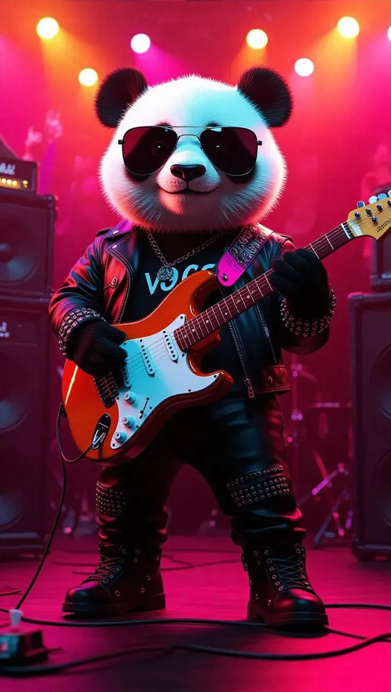 A 3D panda image wearing a rock star outfit and sunglasses, standing upright on two legs like a human, holding a guitar, surrounded by amplifiers and crowds, exuding a vibrant and musical atmosphere.