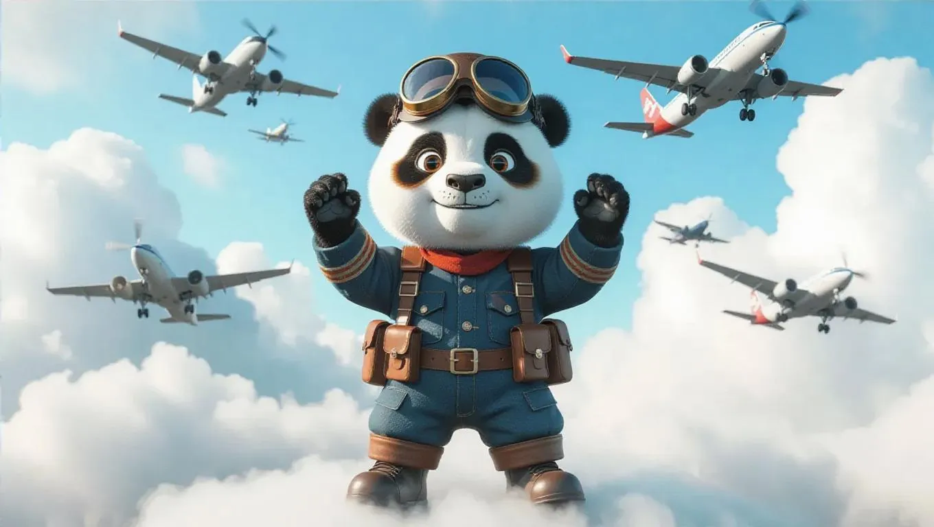 A 3D panda image wearing a pilot's uniform and cap, standing upright on two legs like a human, holding aviator goggles, surrounded by airplanes and clouds, exuding a daring and adventurous atmosphere.
