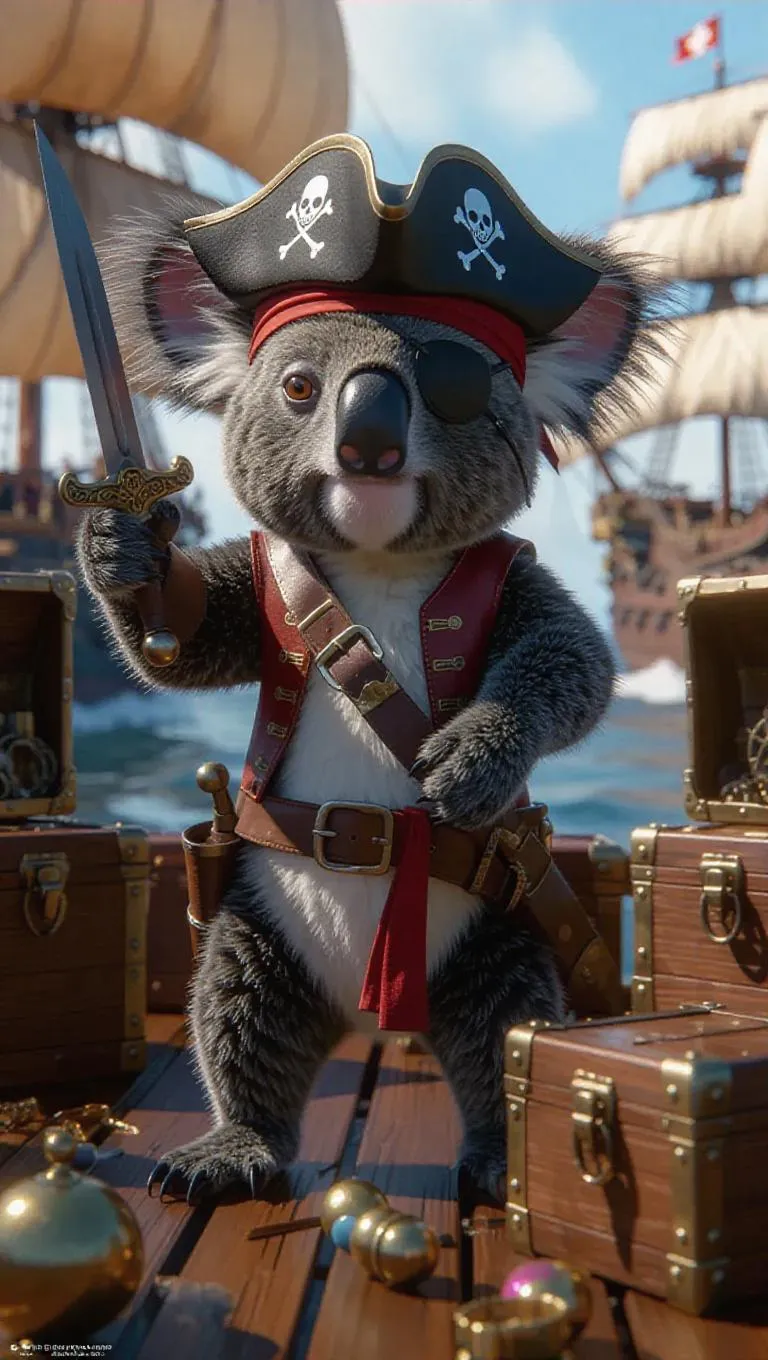 A 3D koala image wearing a pirate's hat and eyepatch, standing upright on two legs like a human, holding a sword, surrounded by treasure chests and a ship, exuding a bold and adventurous atmosphere.