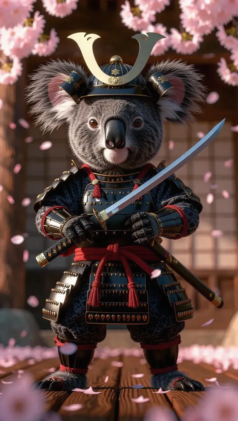 A 3D koala image wearing a samurai armor and helmet, standing upright on two legs like a human, holding a katana, surrounded by cherry blossoms and a dojo, exuding a disciplined and fierce atmosphere.