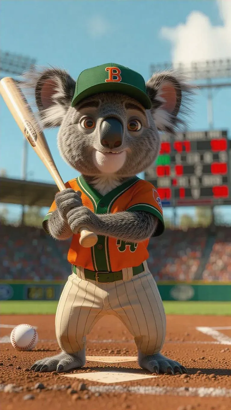 A 3D koala image wearing a sports uniform and cap, standing upright on two legs like a human, holding a baseball bat, surrounded by a field and scoreboard, exuding a competitive and energetic atmosphere.