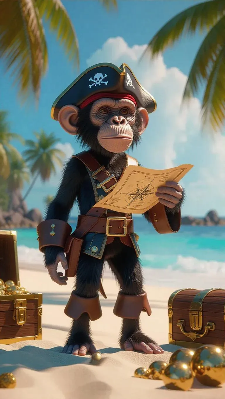 A 3D monkey image wearing a pirate's outfit and hat, standing upright on two legs like a human, holding a treasure map and searching for gold on a sandy beach, surrounded by palm trees and treasure chests, exuding an adventurous and playful atmosphere.