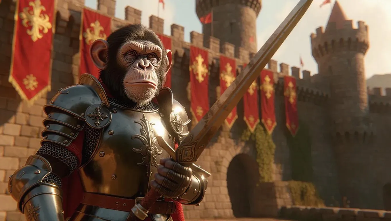 A 3D monkey image wearing a knight's armor and helmet, standing upright on two legs like a human, holding a sword and defending a castle, surrounded by banners and a moat, exuding a noble and heroic atmosphere.