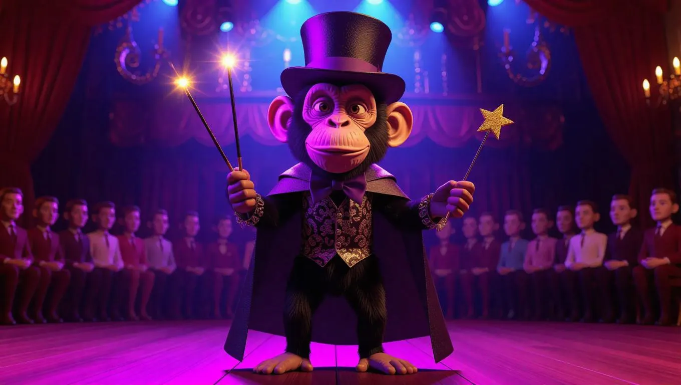 A 3D monkey image wearing a magician's top hat and cape, standing upright on two legs like a human, holding a magic wand and performing tricks on a stage, surrounded by an audience and magical props, exuding a fantastical and entertaining atmosphere.