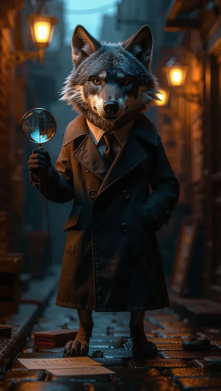 A 3D wolf image wearing a detective's trench coat, standing upright on two legs like a human, holding a magnifying glass, surrounded by clues and a dimly lit alley, exuding a mysterious and intriguing atmosphere.