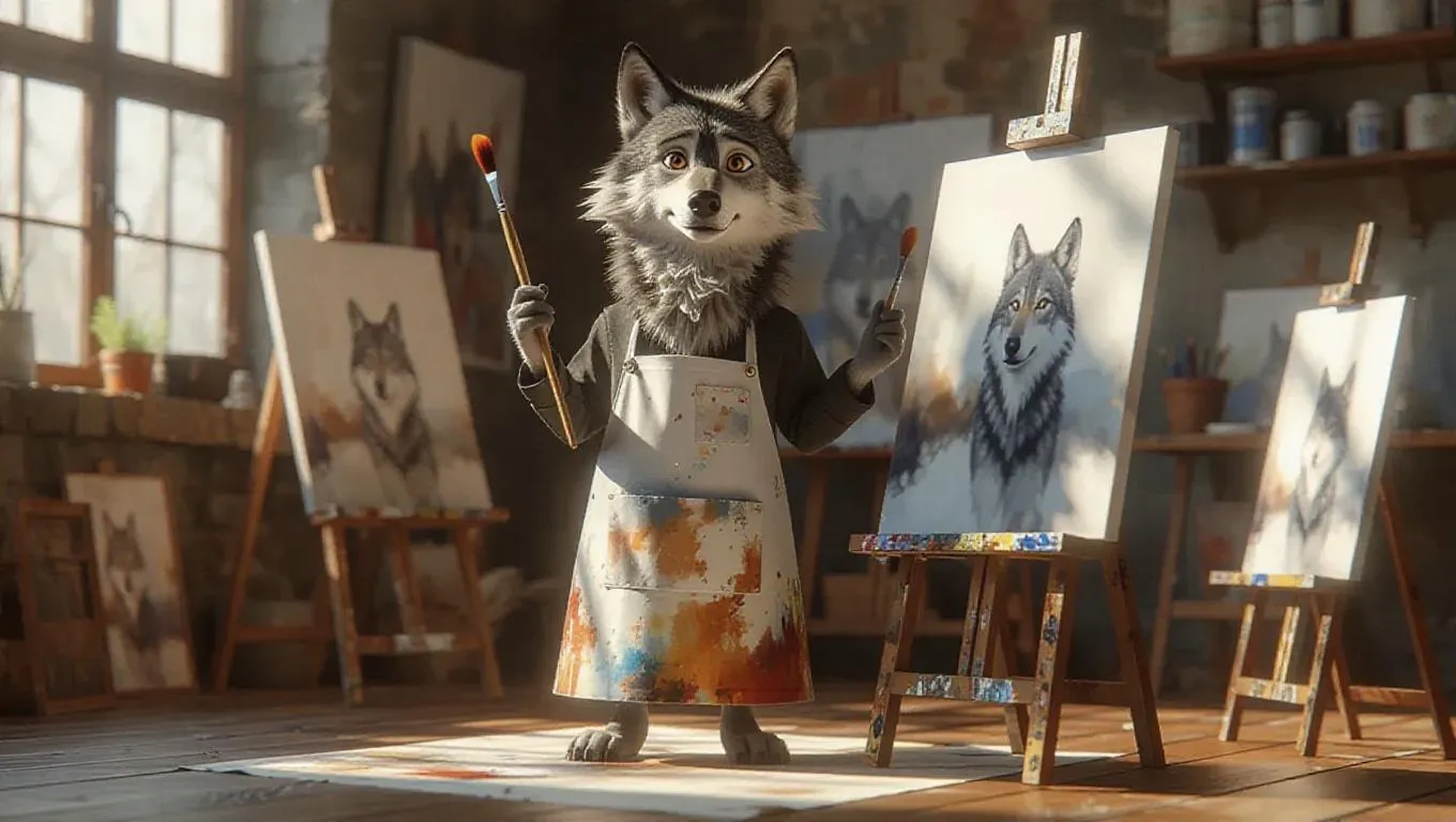 A 3D wolf image wearing an artist's smock, standing upright on two legs like a human, holding a paintbrush, surrounded by canvases and a studio, exuding a creative and inspiring atmosphere.