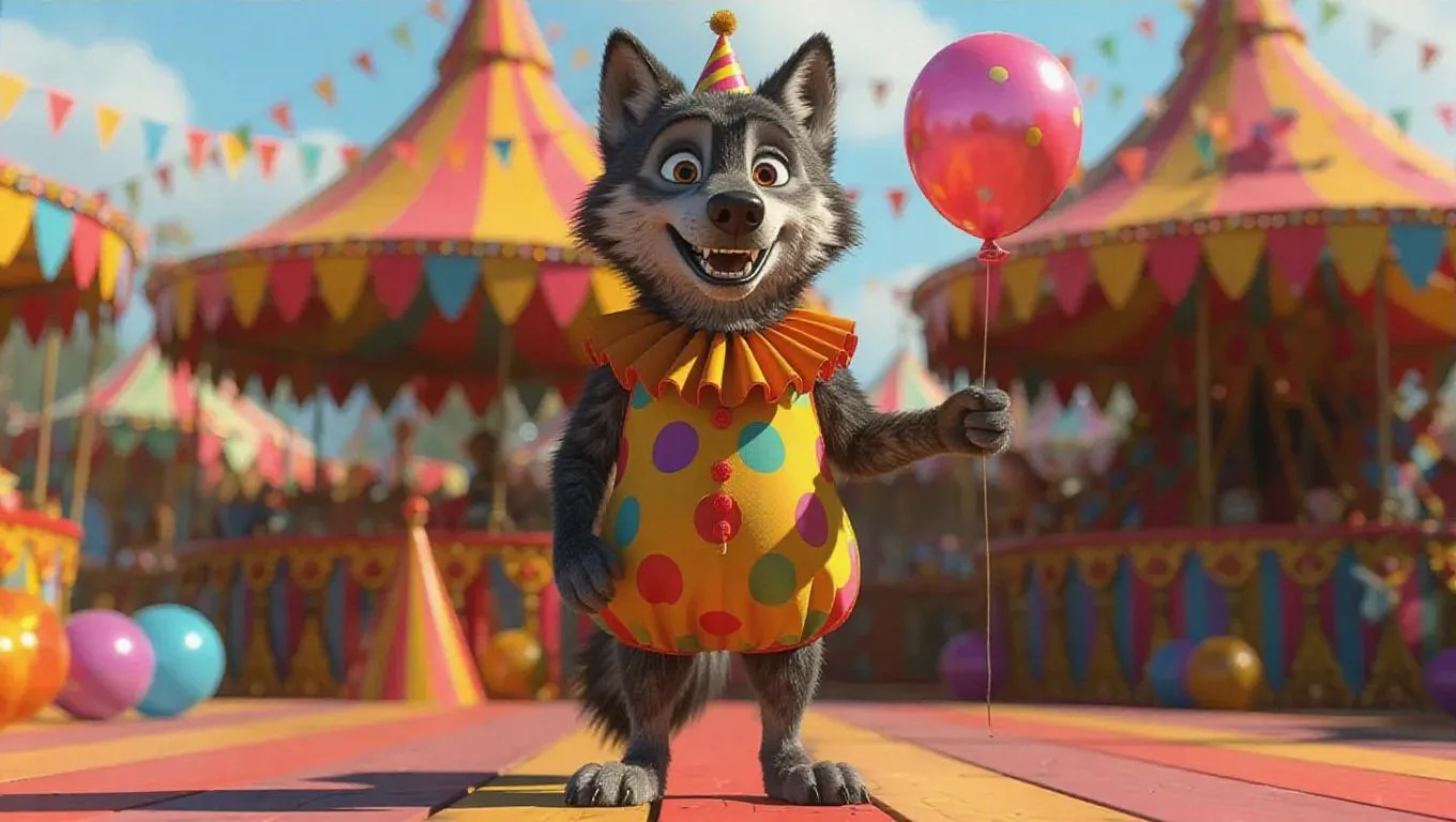 A 3D wolf image wearing a clown costume, standing upright on two legs like a human, holding a balloon, surrounded by colorful decorations and a circus, exuding a fun and playful atmosphere.