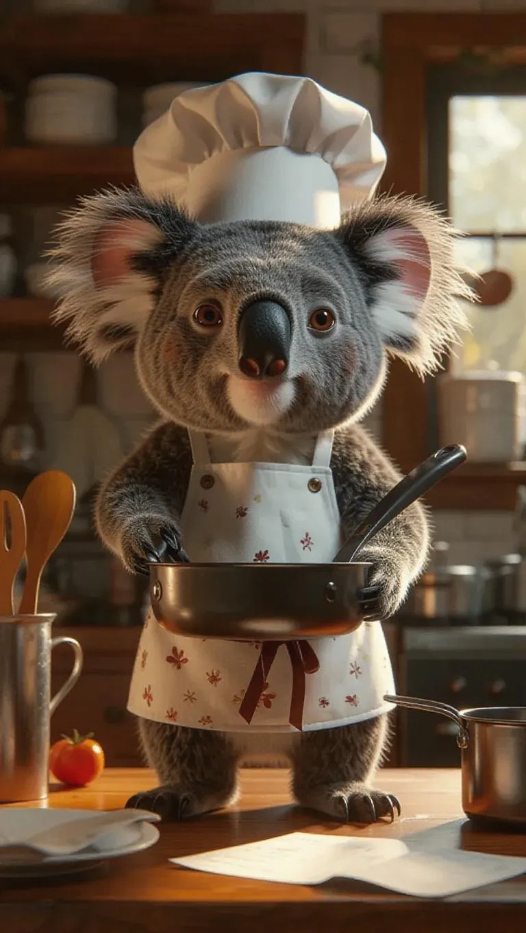 A 3D koala image wearing a chef's hat and apron, standing upright on two legs like a human, holding a frying pan, surrounded by kitchen utensils and recipes, exuding a warm and inviting atmosphere.