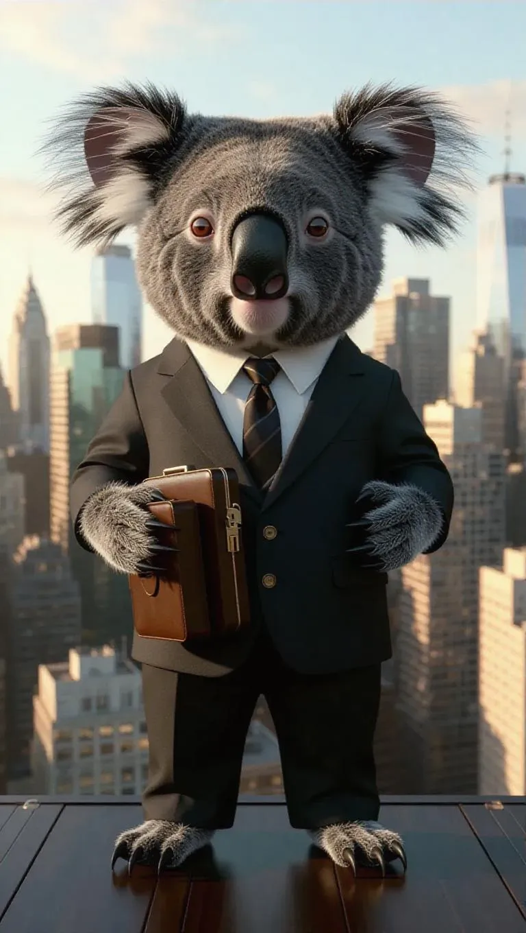 A 3D koala image wearing a formal suit and tie, standing upright on two legs like a human, holding a briefcase, surrounded by a city skyline and office buildings, exuding a professional and corporate atmosphere.