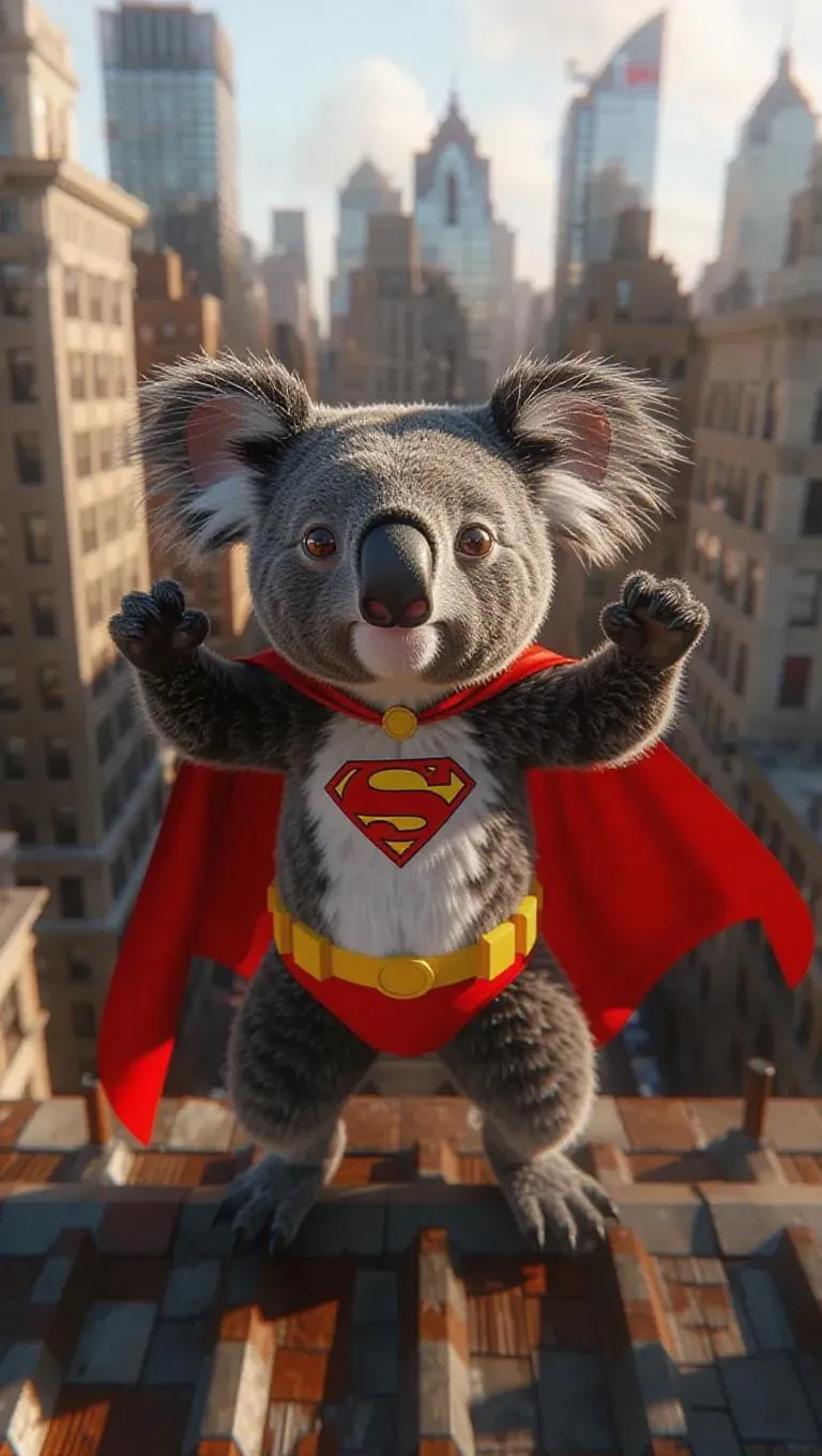 A 3D koala image wearing a superhero costume and cape, standing upright on two legs like a human, striking a heroic pose, surrounded by city rooftops and villains, exuding a dynamic and action-packed atmosphere.