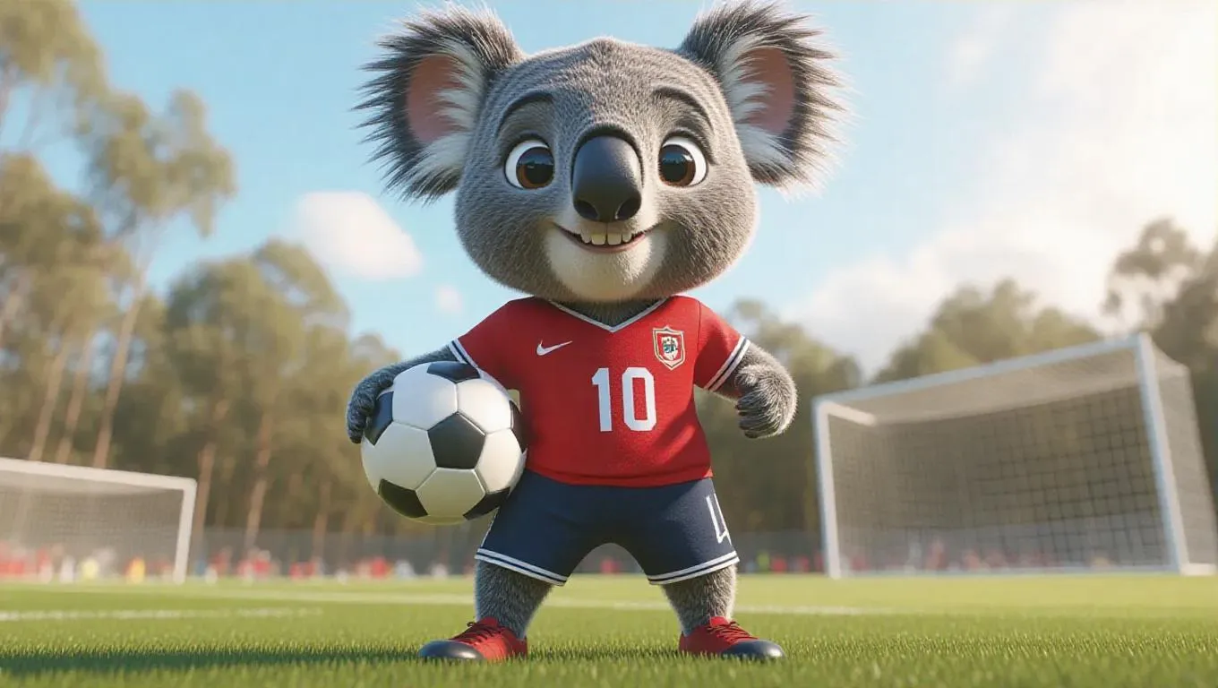A 3D koala image wearing a soccer jersey and shorts, standing upright on two legs like a human, holding a soccer ball, surrounded by a soccer field and goalposts, exuding a sporty and energetic atmosphere.