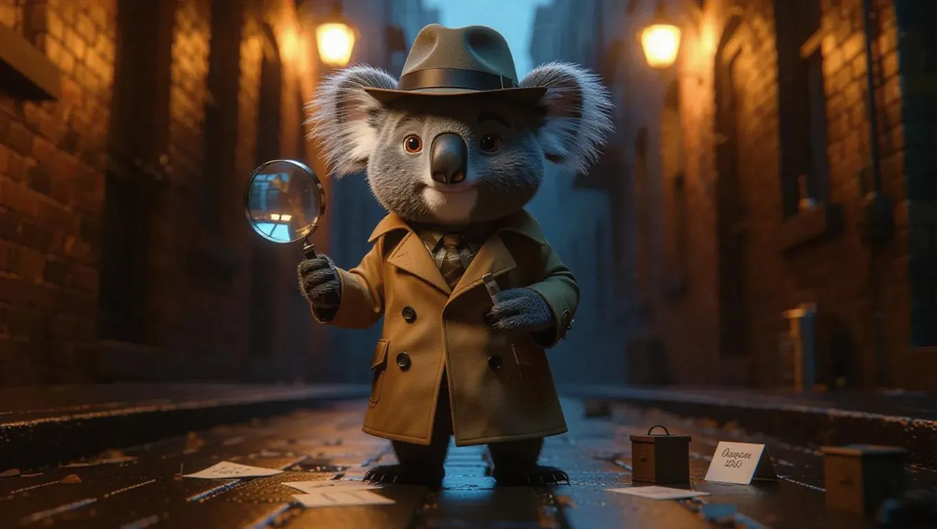 A 3D koala image wearing a detective's trench coat and hat, standing upright on two legs like a human, holding a magnifying glass, surrounded by clues and a dark alley, exuding a mysterious and investigative atmosphere.