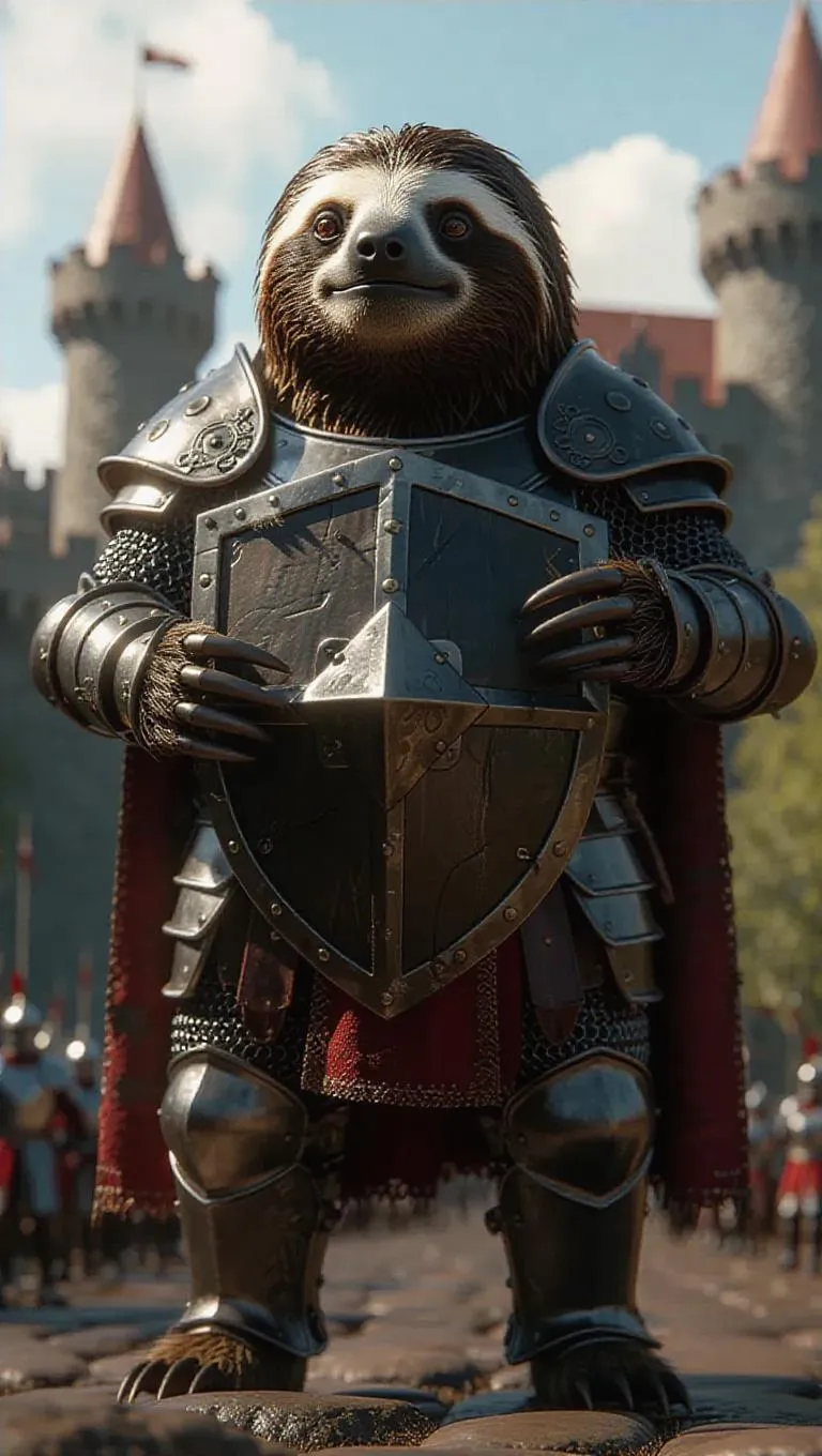 A 3D sloth image wearing a knight's armor, standing upright on two legs like a human, holding a shield, surrounded by a castle and a view of a battlefield, exuding a confident and adventurous atmosphere.