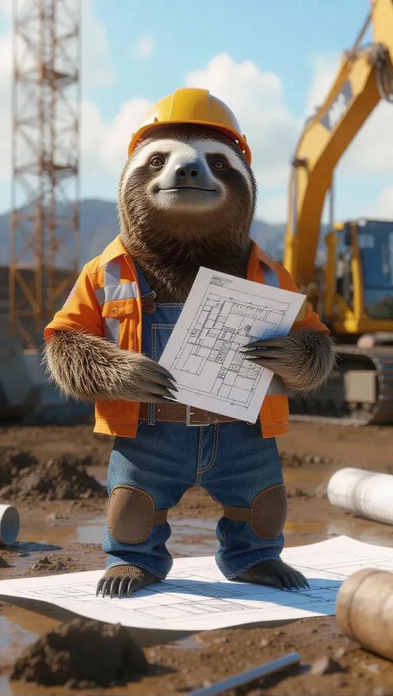 A 3D sloth image wearing a construction worker's outfit, standing upright on two legs like a human, holding a blueprint, surrounded by a construction site and a view of heavy machinery, exuding a confident and adventurous atmosphere.