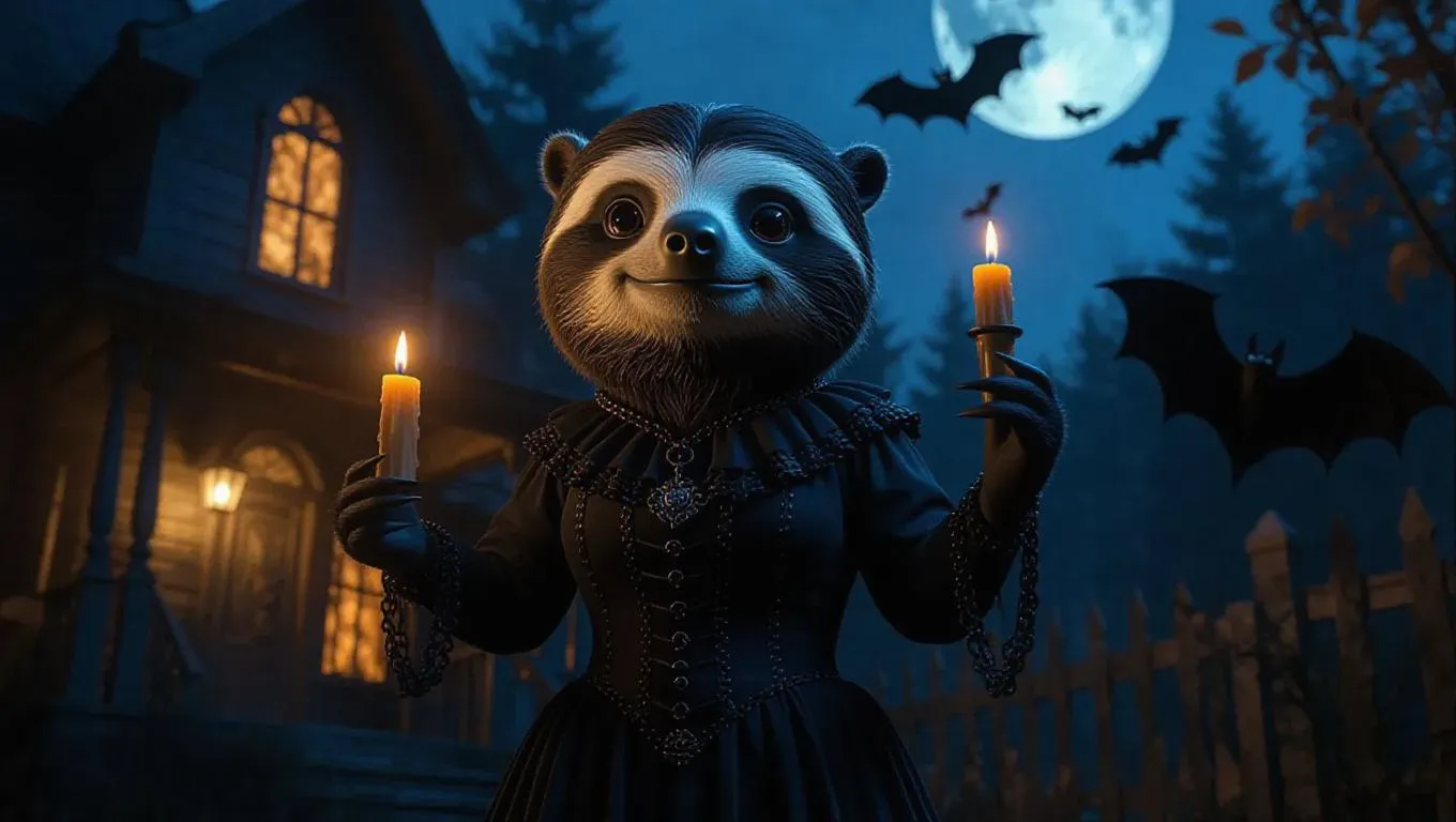 A 3D sloth image wearing a gothic outfit, standing upright on two legs like a human, holding a candle, surrounded by a haunted house and a view of bats, exuding a confident and adventurous atmosphere.