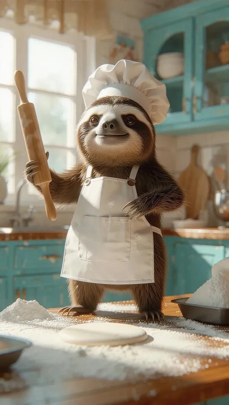 A 3D sloth image wearing a baker's apron and hat, standing upright on two legs like a human, holding a rolling pin and rolling out dough in a bright, sunny kitchen, surrounded by flour and a baking tray, exuding a joyful and creative atmosphere.