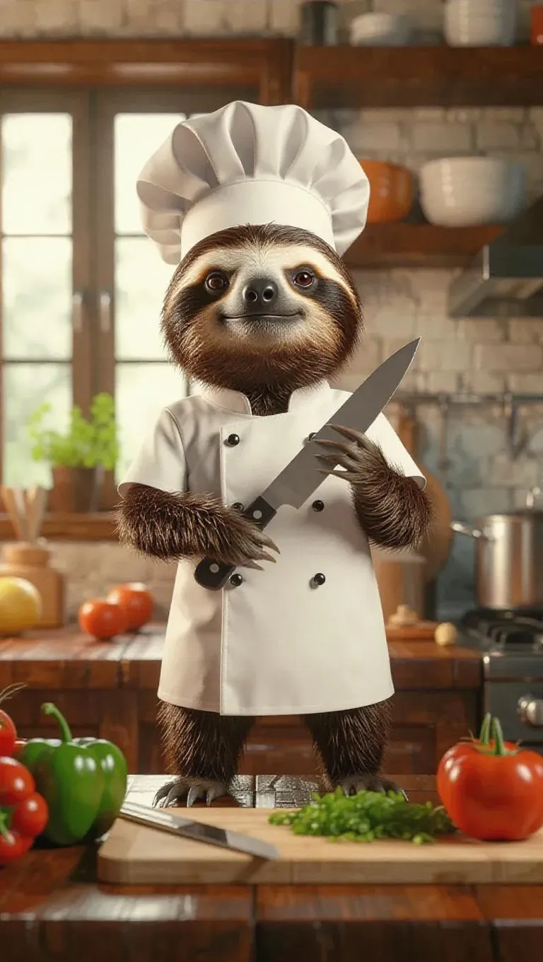A 3D sloth image wearing a traditional chef's uniform and toque, standing upright on two legs like a human, holding a knife and chopping vegetables in a well-lit, gourmet kitchen, surrounded by fresh produce and a cutting board, exuding a focused and professional atmosphere.