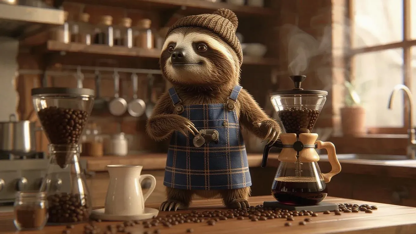A 3D sloth image wearing a hipster apron and beanie, standing upright on two legs like a human, holding a coffee grinder and brewing coffee in a trendy, urban kitchen, surrounded by coffee beans and artisan tools, exuding a calm and relaxed atmosphere.