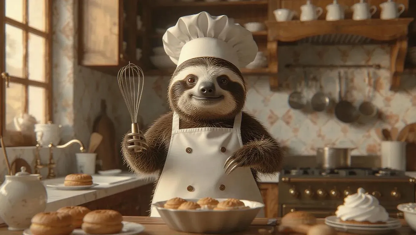 A 3D sloth image wearing a classic chef’s apron and chef hat, standing upright on two legs like a human, holding a whisk and preparing a soufflé in an elegant Parisian kitchen, surrounded by pastries and baking tools, exuding a charming and sophisticated atmosphere.