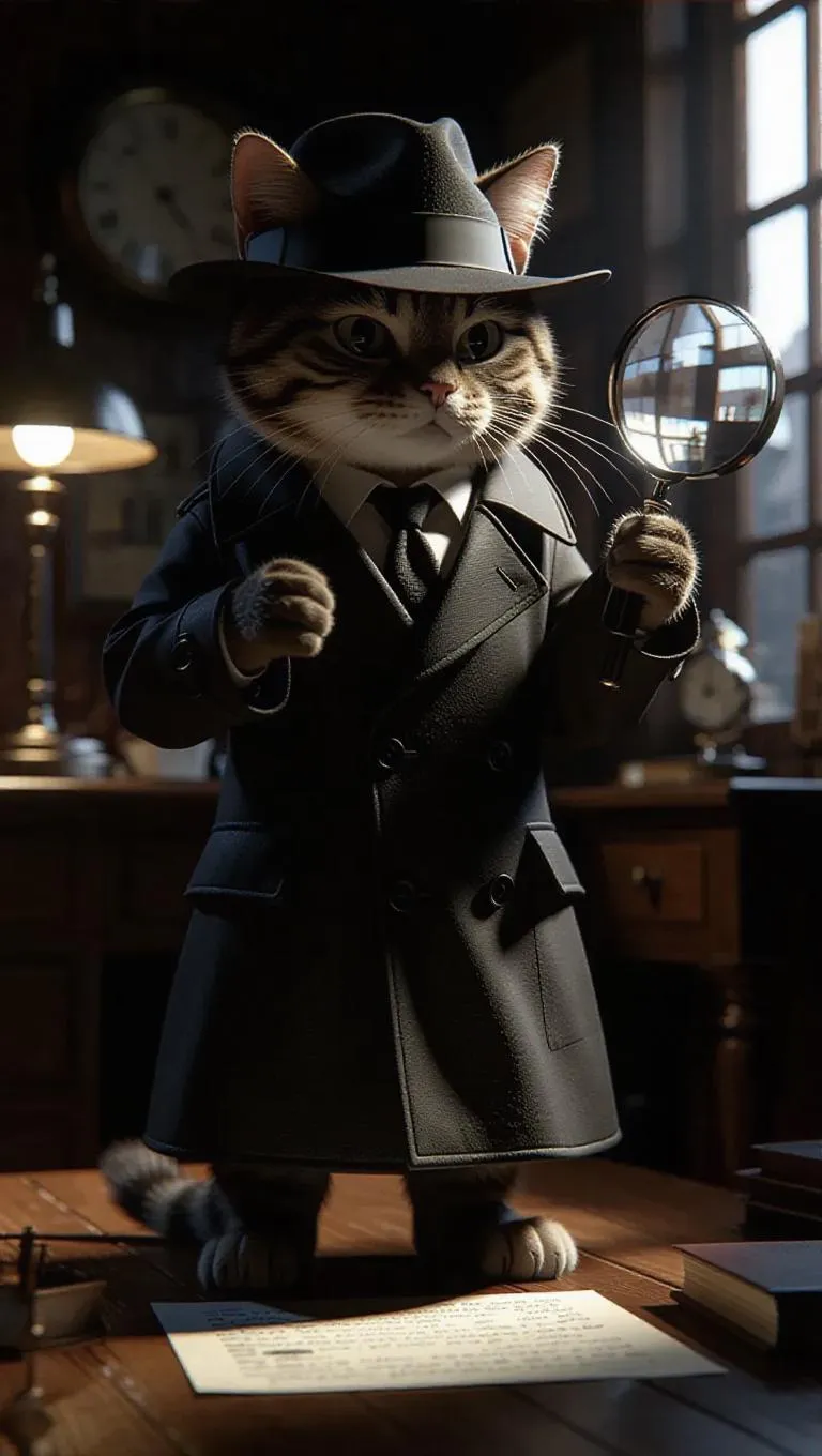 A 3D cat image wearing a sleek detective's trench coat and a fedora, standing upright on two legs, holding a magnifying glass and examining a clue, surrounded by vintage office decor and mysterious shadows, exuding an enigmatic and intriguing atmosphere.