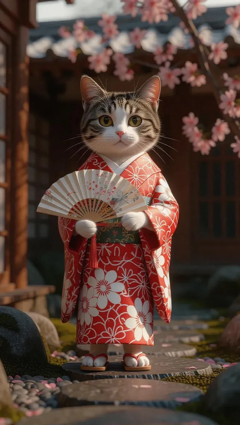 A 3D cat image wearing a traditional Japanese kimono and geta sandals, standing upright on two legs, holding a delicate fan, surrounded by a serene zen garden with cherry blossoms, exuding a peaceful and calming spirit.