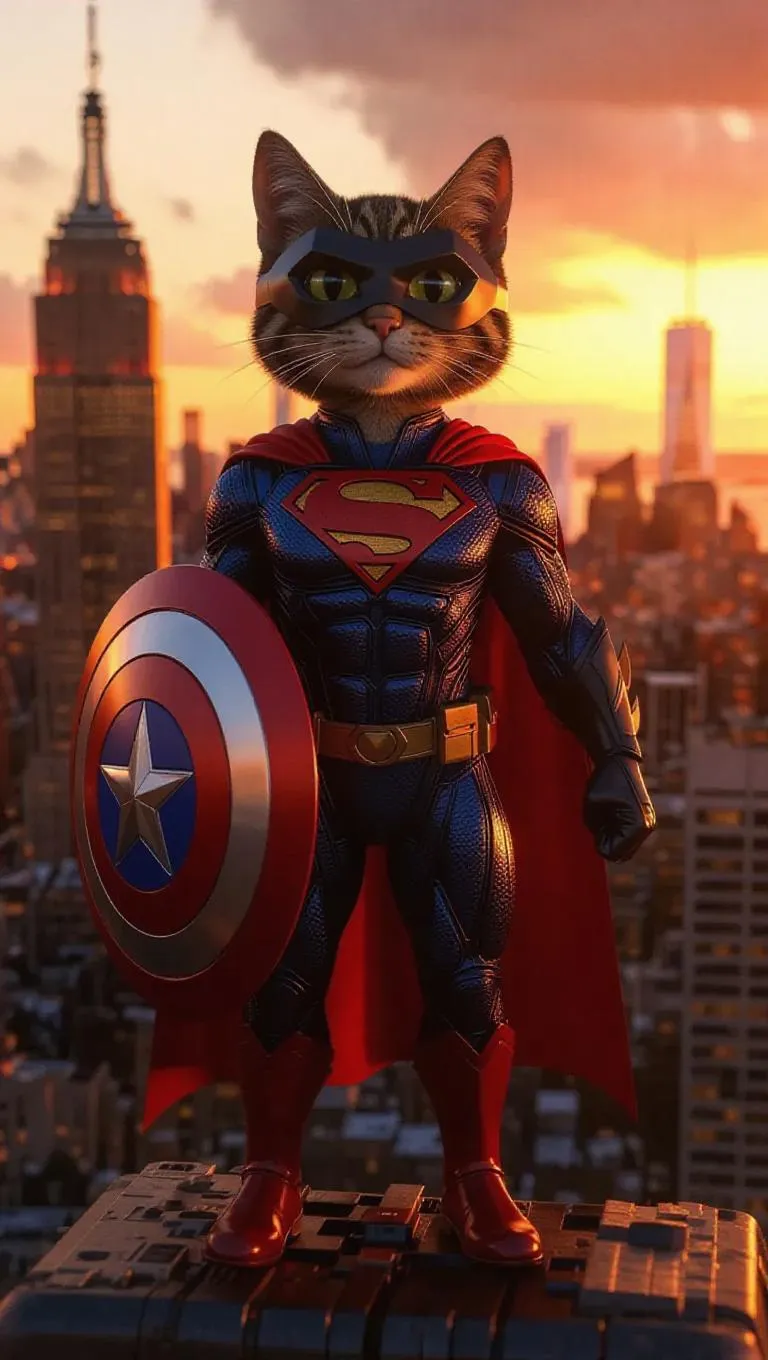 A 3D cat image wearing an elite superhero suit and mask, standing upright on two legs, holding a shield with a logo, surrounded by a bustling city skyline at sunset, exuding a bold and courageous presence.