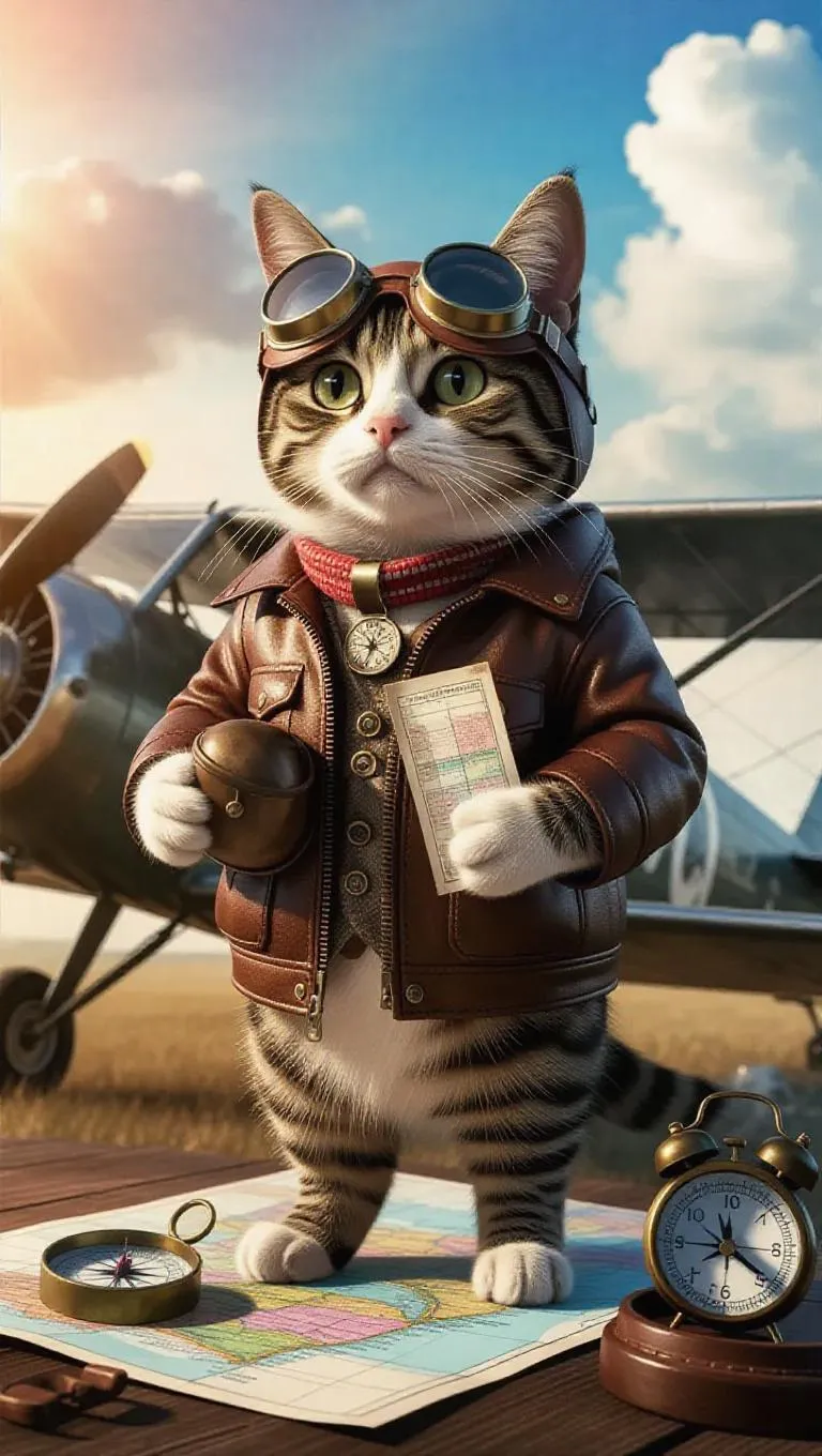 A 3D cat image wearing a vintage aviator's jacket and goggles, standing upright on two legs, holding a map and a compass, surrounded by a biplane and a picturesque sky, exuding a sense of adventure and exploration.