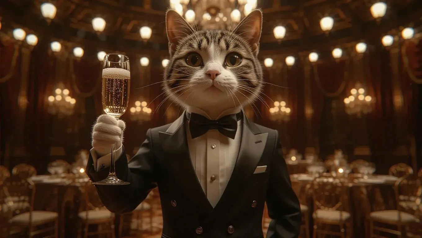 A 3D cat image wearing a formal tuxedo and bow tie, standing upright on two legs, holding a champagne glass, surrounded by elegant decorations at a gala event, exuding a sophisticated and classy ambiance.