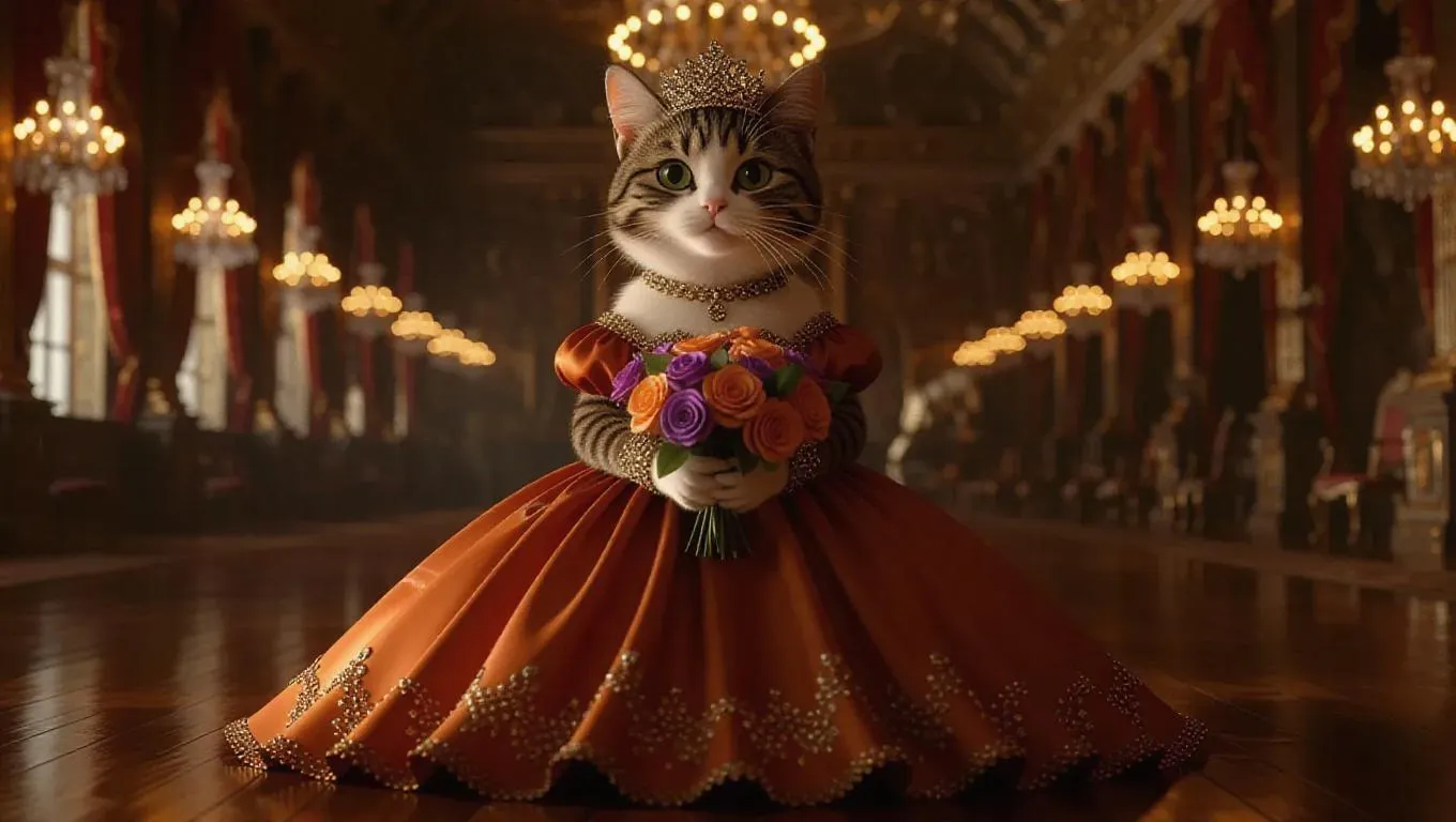 A 3D cat image wearing a beautiful ball gown and tiara, standing upright on two legs, holding a bouquet of flowers, surrounded by a grand ballroom with chandeliers, exuding a glamorous and enchanting atmosphere.