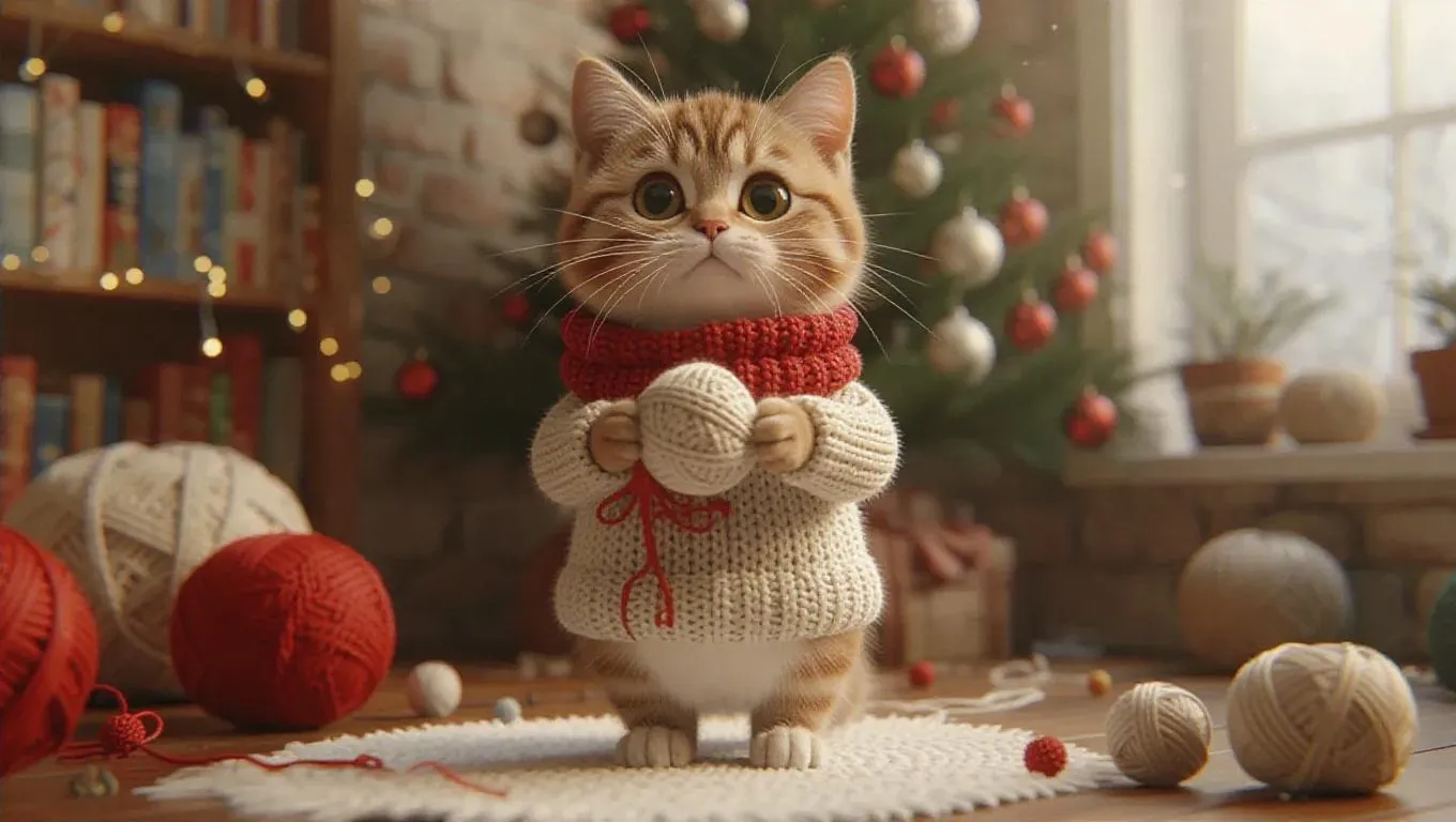 A 3D cat image wearing a cozy knit sweater and scarf, standing upright on two legs, holding a yarn ball, surrounded by a cozy knitting corner at home, exuding a warm and homely feeling.