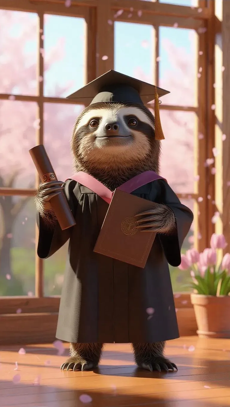 A 3D sloth image wearing a graduation gown, standing upright on two legs like a human, holding a diploma and a cap, surrounded by a university campus and a spring view through the window, exuding an accomplished and celebratory atmosphere.
