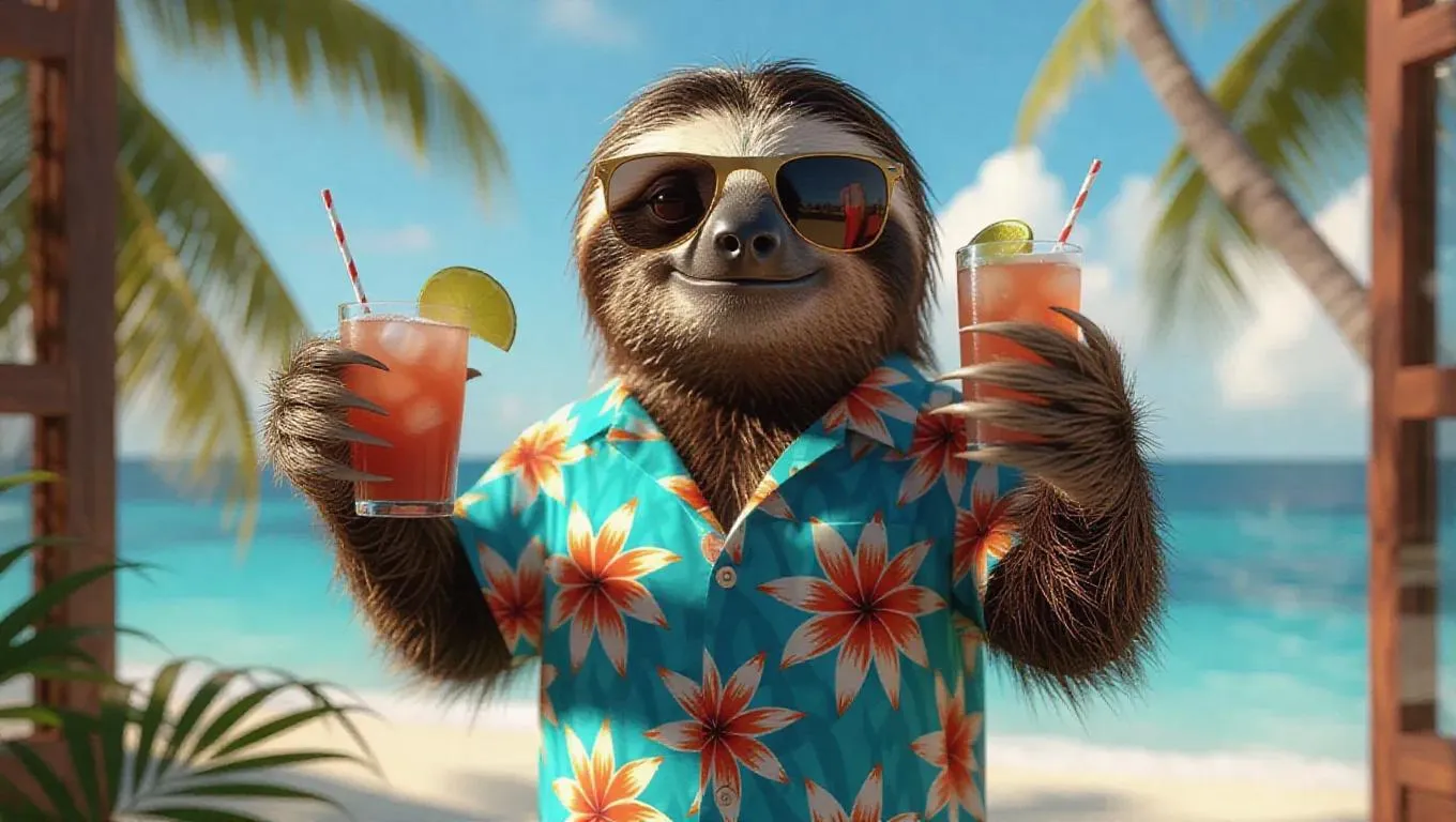 A 3D sloth image wearing a tropical shirt, standing upright on two legs like a human, holding a cocktail and a pair of sunglasses, surrounded by a beach scene and an ocean view through the window, exuding a summery and carefree atmosphere.