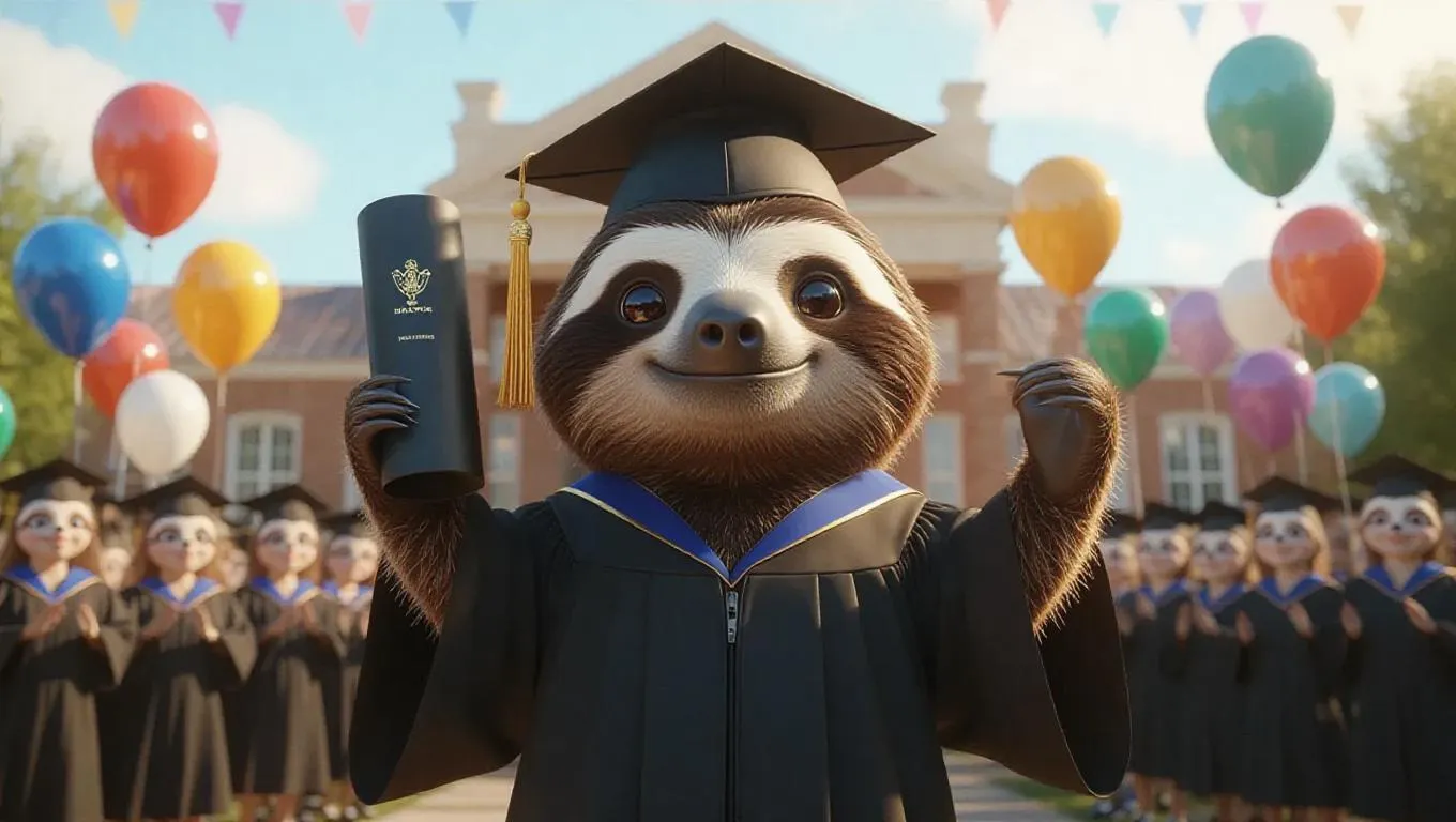 A 3D sloth image wearing a graduation cap and gown, holding a diploma in one hand, standing in front of a school building, surrounded by classmates and balloons, exuding a celebratory and proud atmosphere.