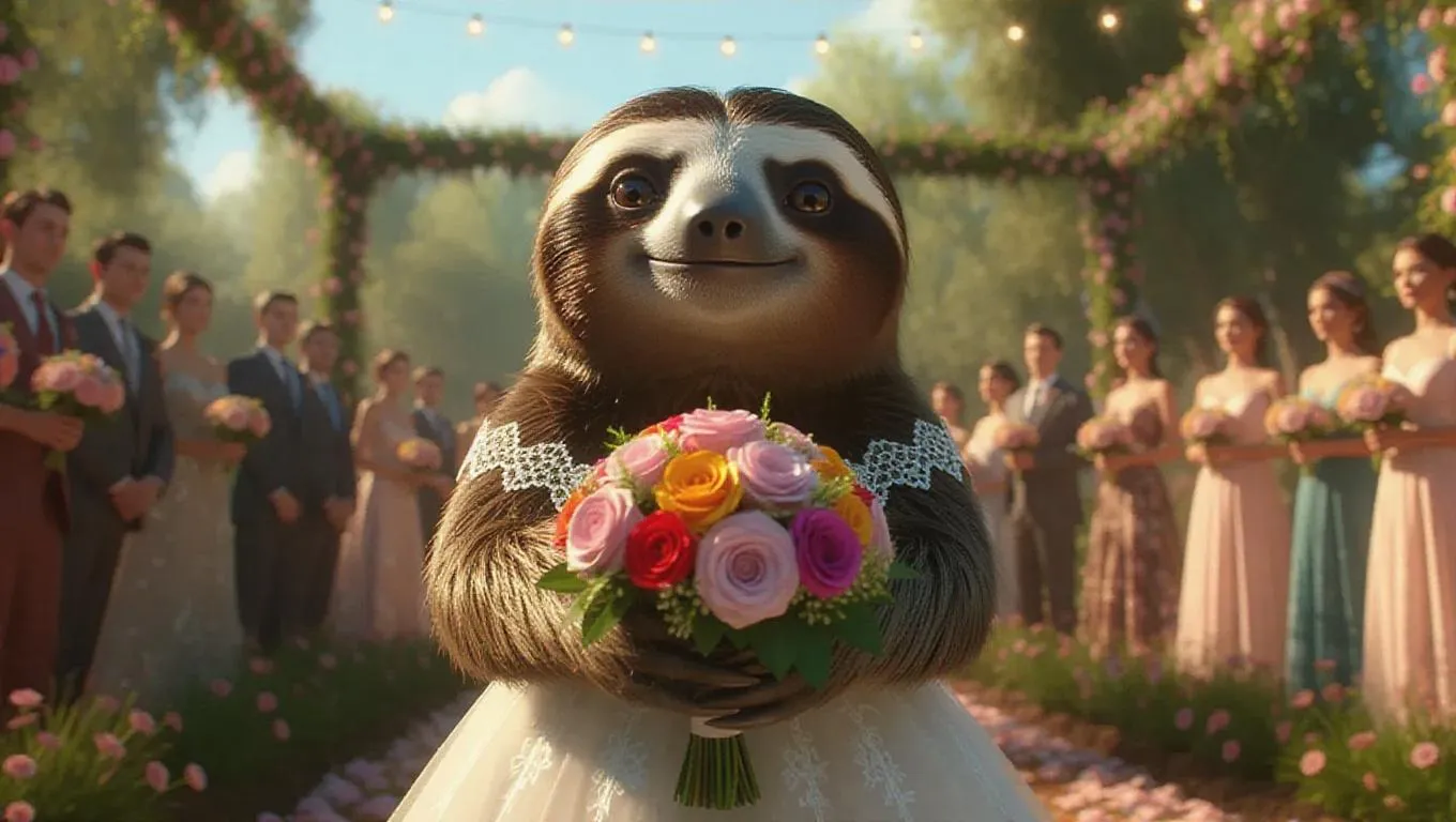 A 3D sloth image in a bridal gown, holding a bouquet of flowers, standing in a beautiful garden, surrounded by guests and decorations, exuding a romantic and joyous atmosphere.