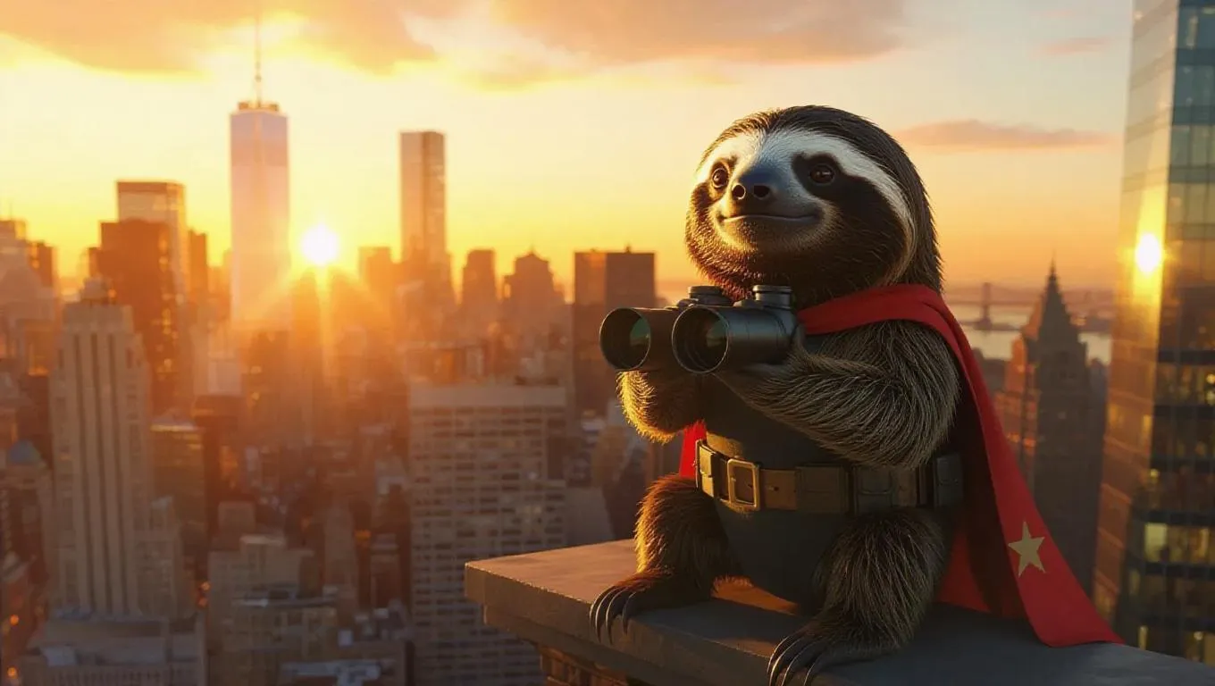 A 3D sloth image wearing a superhero costume, perched on a building edge, looking vigilant while holding binoculars, surrounded by urban skyscrapers and a sunset, exuding a heroic and watchful atmosphere.