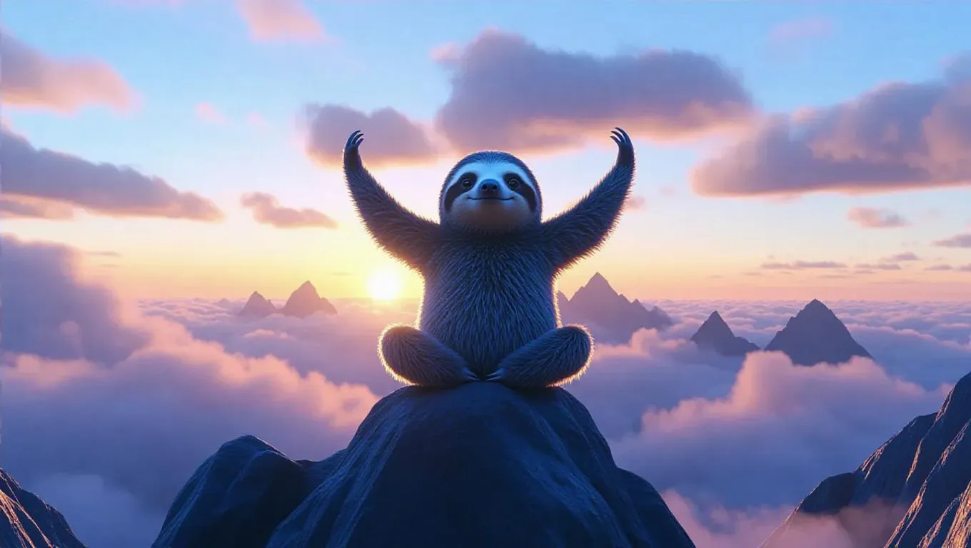 A 3D sloth image in a yoga pose on a mountain top at sunset, surrounded by clouds and tranquil scenery, exuding a peaceful and meditative atmosphere.