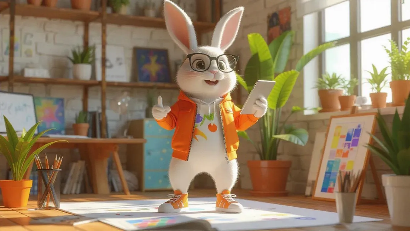 A 3D bunny model in a sporty graphic designer's getup, energetically standing on one leg, holding a tablet and brainstorming ideas, surrounded by an open and airy workspace filled with vibrant art and plants, exuding a fresh and inspiring atmosphere.