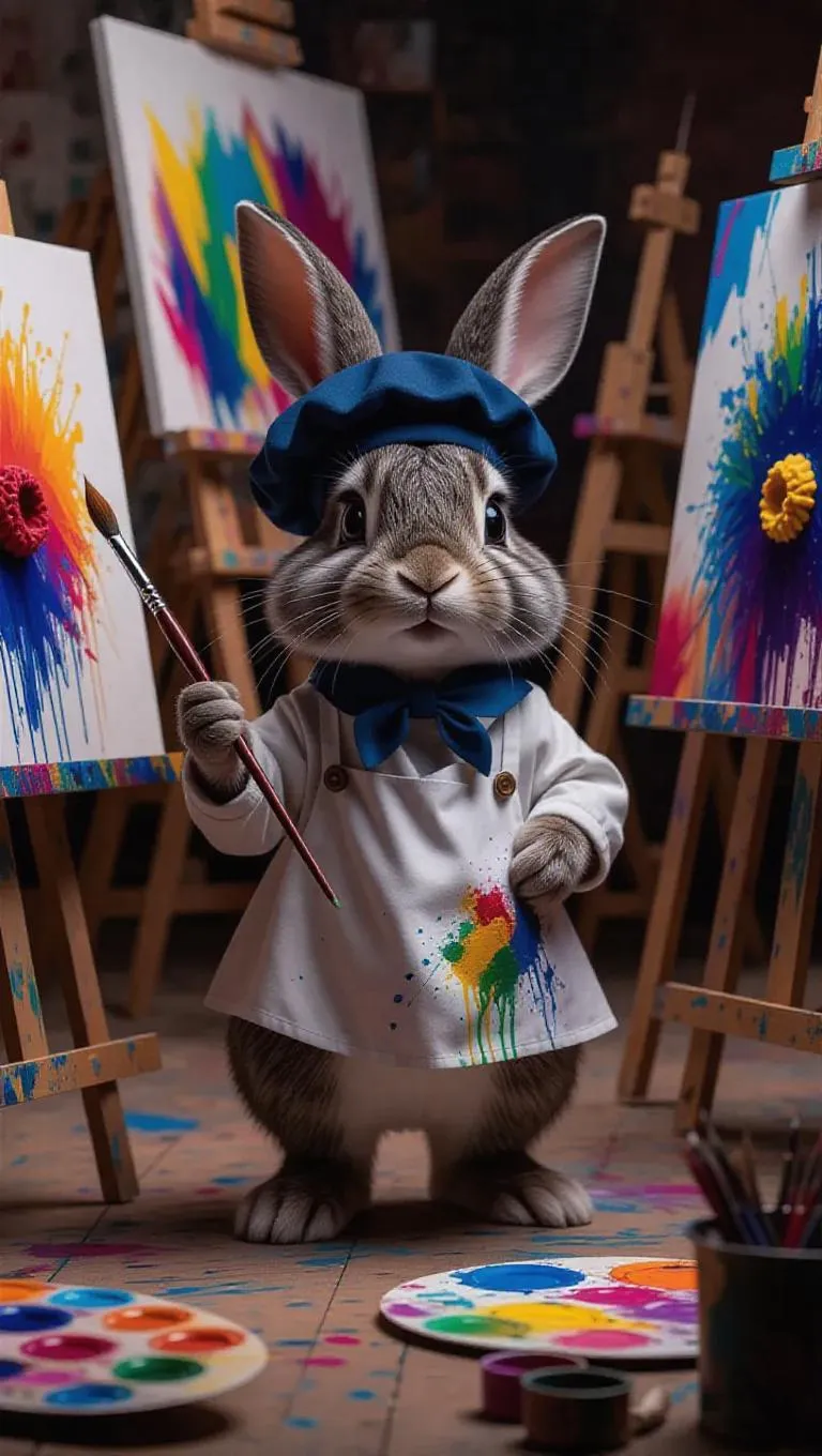 A 3D bunny in an artist's smock and beret, standing upright on two legs, holding a paintbrush with creativity. Surrounded by splattered canvases and color palettes, the bunny exudes inspiration and art in a studio setting, with a backdrop of easels and vibrant paintings.