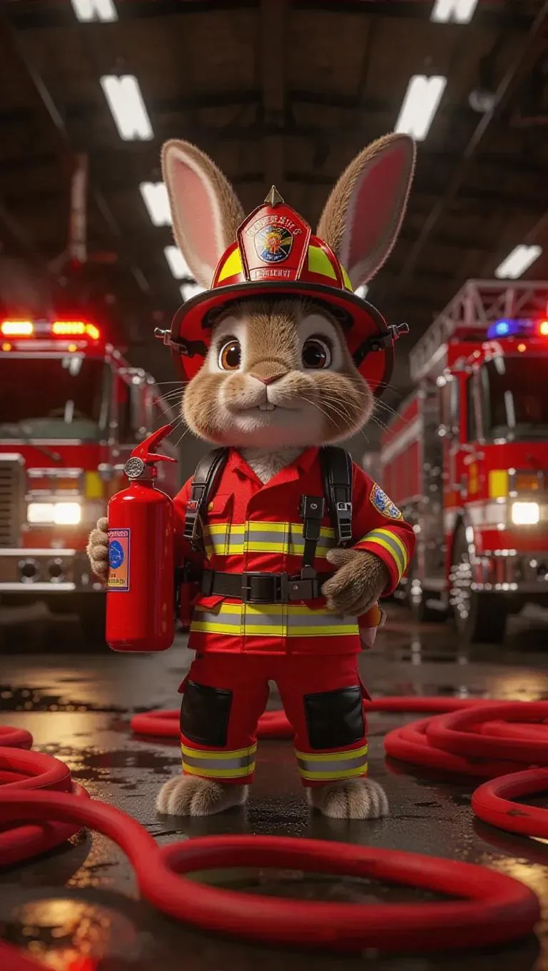 A 3D bunny in a firefighter's uniform and helmet, standing upright on two legs, holding a fire extinguisher with bravery. Surrounded by hoses and safety equipment, the bunny exudes courage and heroism in a fire station setting, with a backdrop of fire trucks and emergency lights.