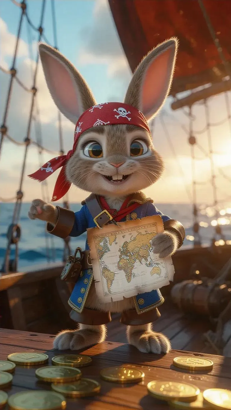 A 3D bunny in a pirate's outfit and bandana, standing upright on two legs, holding a treasure map with determination. Surrounded by gold coins and nautical equipment, the bunny exudes adventure and excitement on a ship, with a backdrop of the open sea and a setting sun.