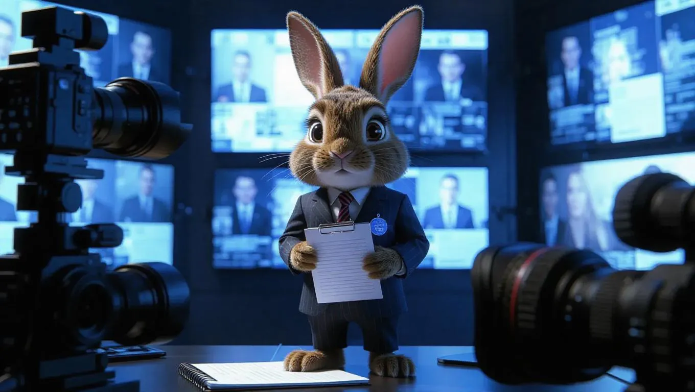A 3D bunny in a journalist's suit and press badge, standing upright on two legs, holding a notepad with determination. Surrounded by cameras and microphones, the bunny exudes urgency and truth in a newsroom setting, with a backdrop of screens and breaking news.