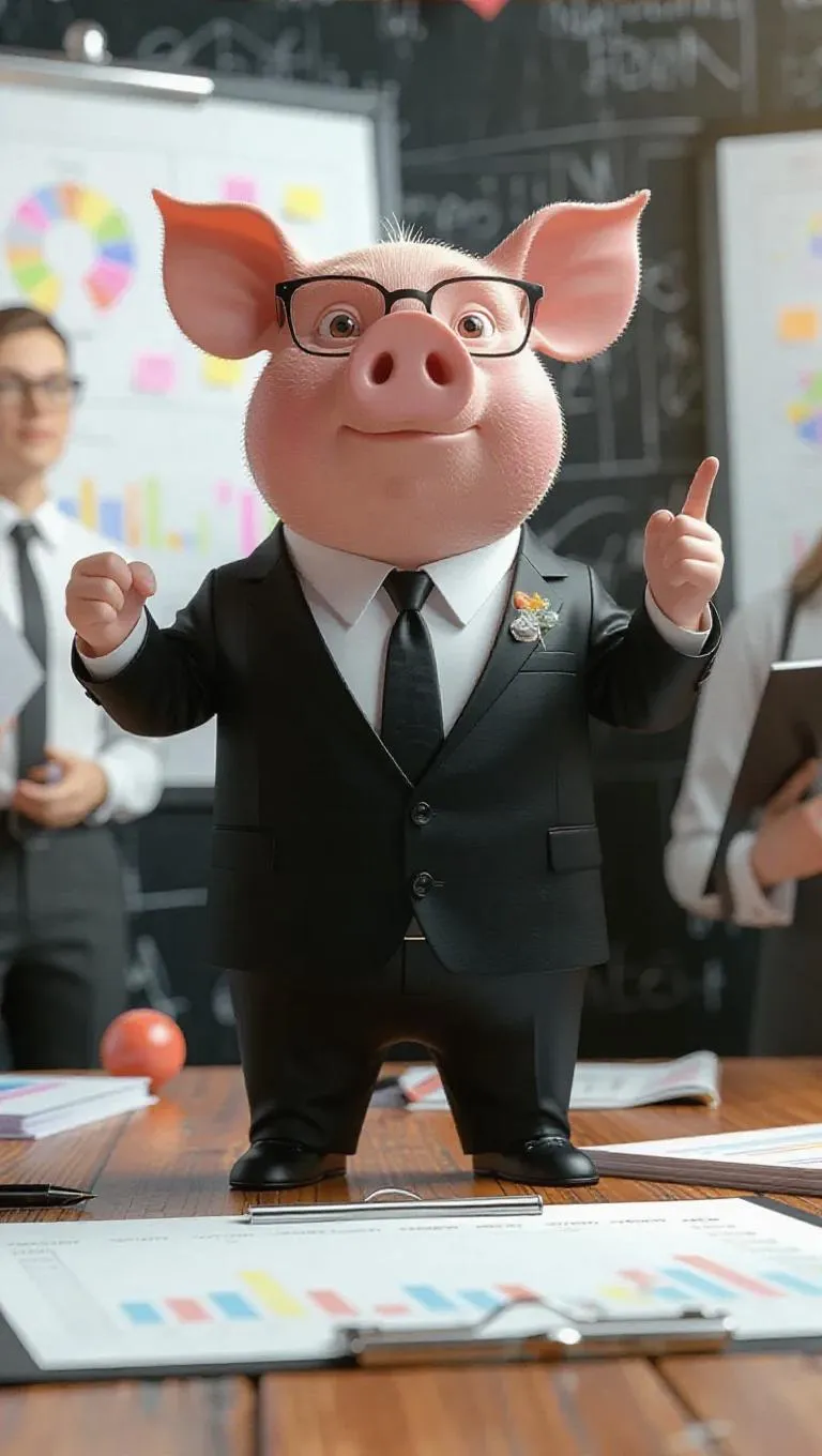 A 3D pig image wearing a project manager's suit and tie, standing upright on two legs like a human, holding a clipboard and pointing at a Gantt chart, surrounded by a whiteboard and a team meeting in progress, exuding a leadership and organized atmosphere.