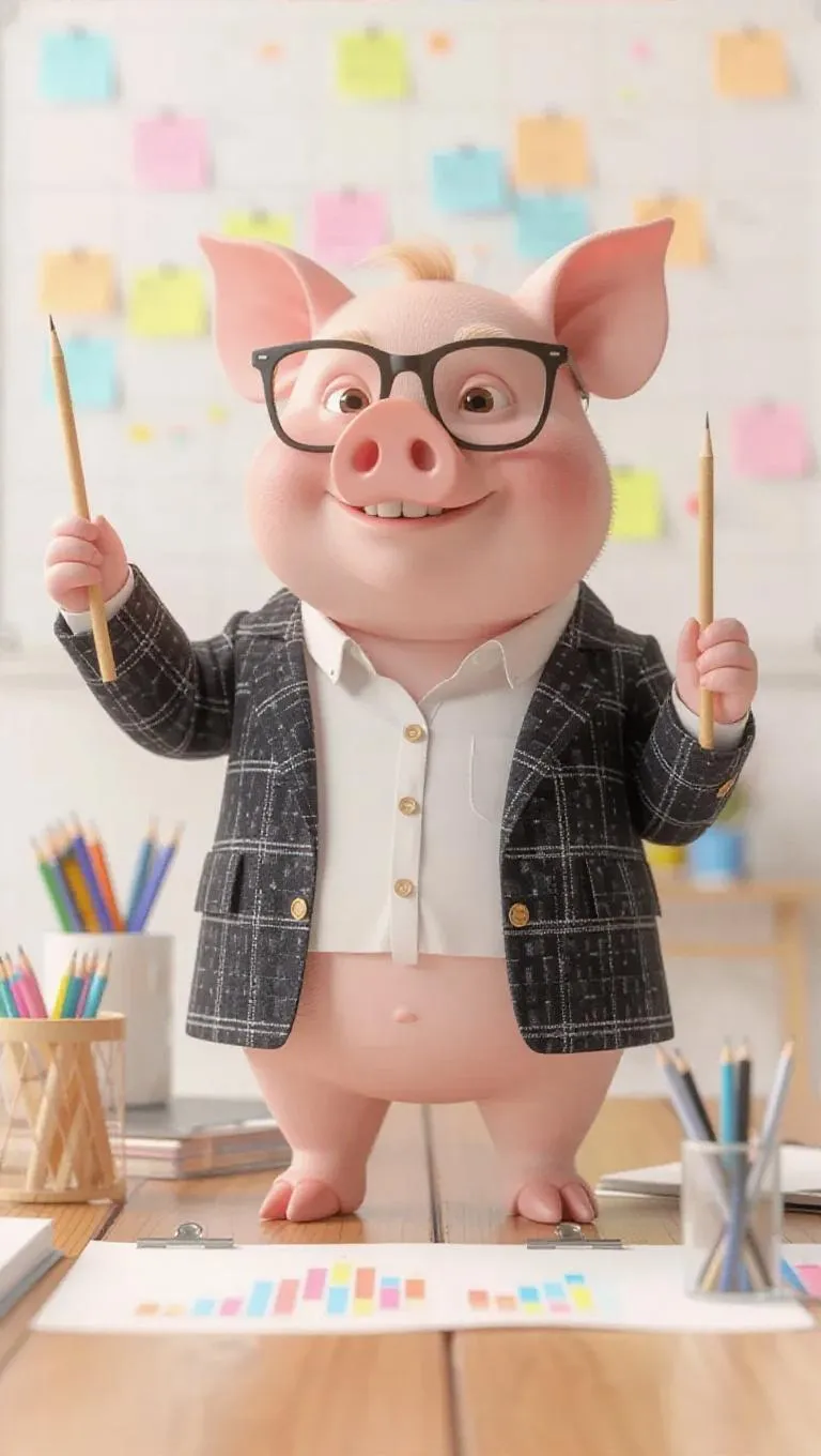 A 3D pig image wearing a project manager's blazer and glasses, standing upright on two legs like a human, holding a pointer stick and indicating a Gantt chart, surrounded by a whiteboard and a team meeting in progress, exuding a leadership and authoritative atmosphere.