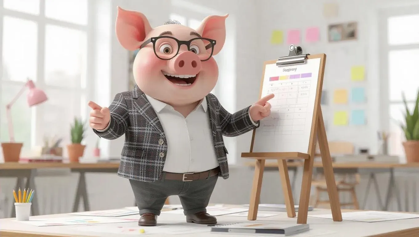 A 3D pig image wearing a project manager's blazer and glasses, standing upright on two legs like a human, holding a clipboard and enthusiastically pointing at a Gantt chart, surrounded by a whiteboard and a creative meeting in progress, exuding a leadership and innovative atmosphere.