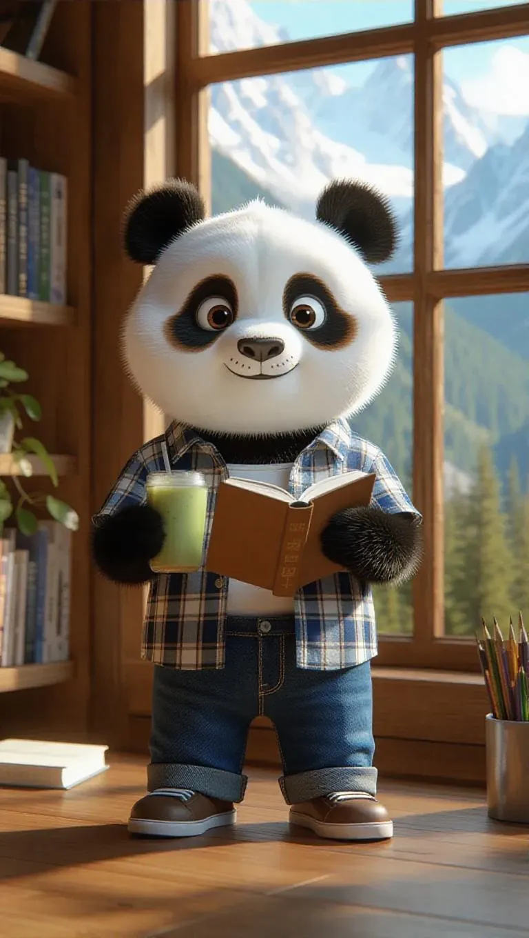 A 3D panda image wearing a casual shirt and jeans, standing upright on two legs like a human, holding a book and a smoothie, surrounded by a cozy home office and a mountain view through the window, exuding a relaxed and creative atmosphere.