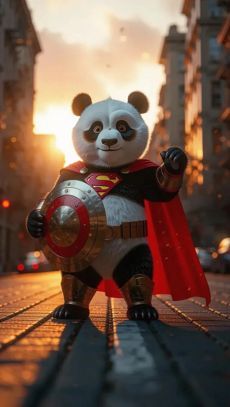 A 3D panda image wearing a superhero costume, standing upright on two legs like a human, holding a shield and a cape, surrounded by a city street and a sunset view through the window, exuding a heroic and adventurous atmosphere.