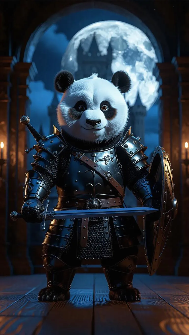 A 3D panda image wearing a medieval armor and helmet, standing upright on two legs like a human, holding a sword and shield, surrounded by a castle interior and a moonlit night view through the window, exuding a heroic and mystical atmosphere.