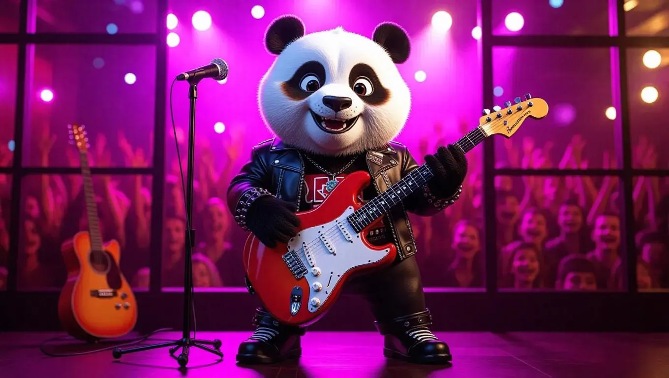 A 3D panda image wearing a rocker outfit, standing upright on two legs like a human, holding a guitar and microphone, surrounded by a music stage and a vibrant crowd view through the window, exuding an energetic and lively atmosphere.